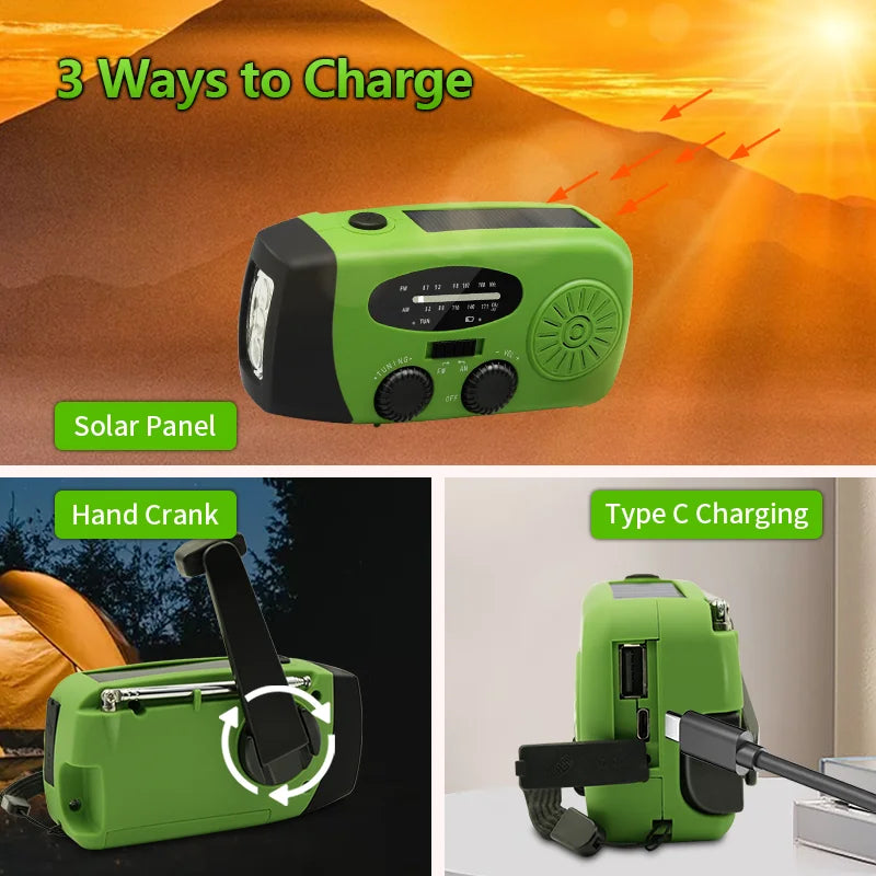*3 Rechargeable Ways: Micro USB charging, Solar charging, Manual hand crank to wind up the internal battery.