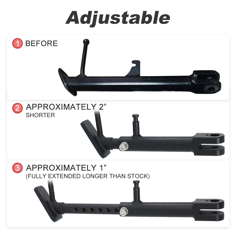 The kickstand can go from stock length to approximately 2''(50.8 mm) shorter. It can also be extended approximately 1''(25.4 mm)  longer