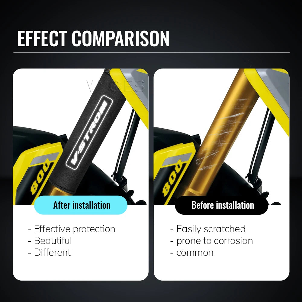 Velcro design, sticky, no tools required, easy to install. The high quality product is durable and protects the front fork suspension for longer.