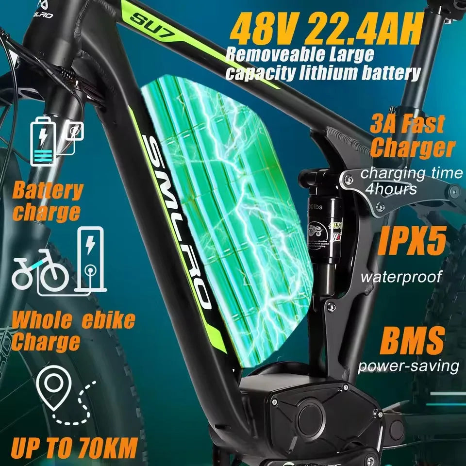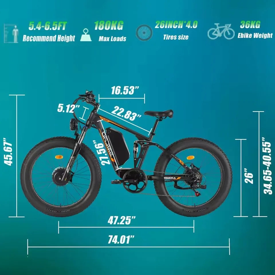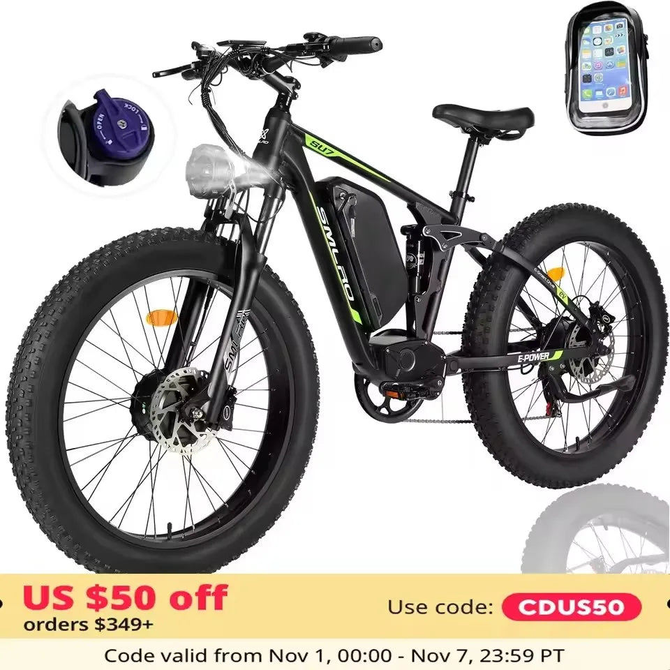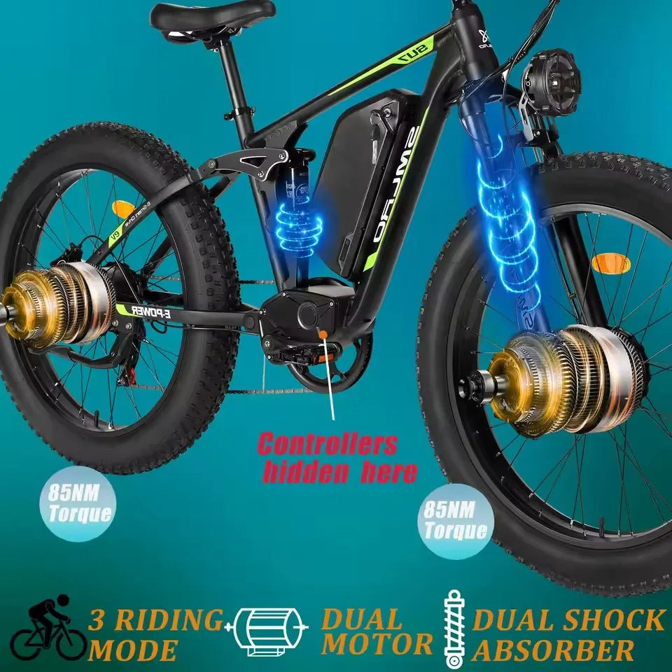 Hots Sales Su7 2000W Dual Motor Electric Bicycle, 7 Speed 35MPH MTB, 48V 22.4AH 26 ''Fat Tire Ebike with Full Suspension