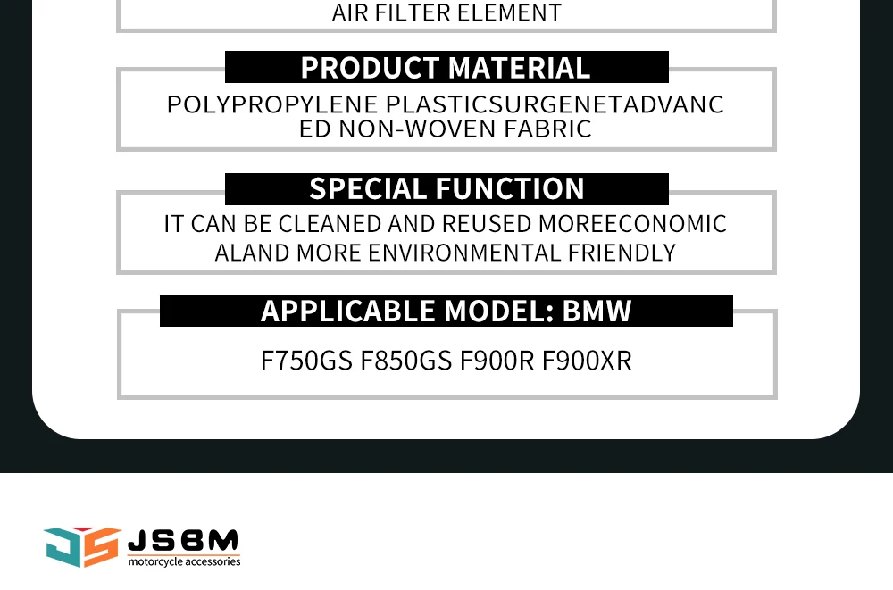 JSBM Motorcycle Washable Air Filter For BMW F750GS F850GS F900R F900XR Loncin Valico Voge 900 DSX DS BM-8518 HFA7801 PM188T12