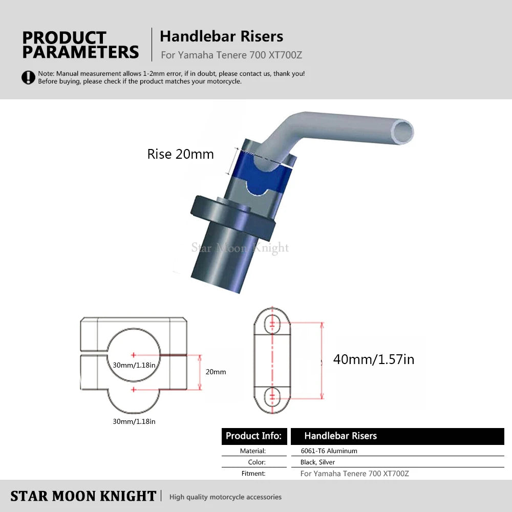 1.Raises handlebars by 20mm (3/4 inch) 2.Relieves neck, back, and shoulder strain 3.Provides better standing position 4.Made of Black or Silver anodized aluminum 5.Quick and easy to install or Refer to the installation instructions