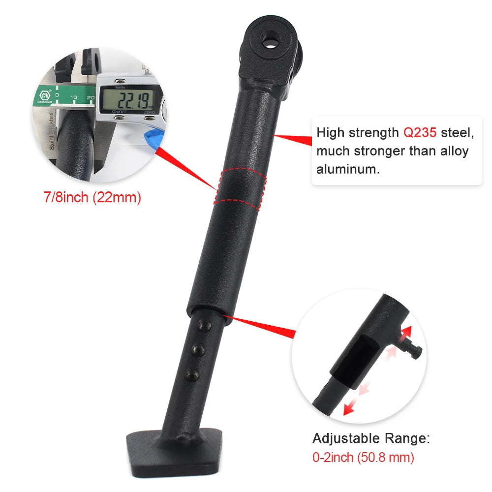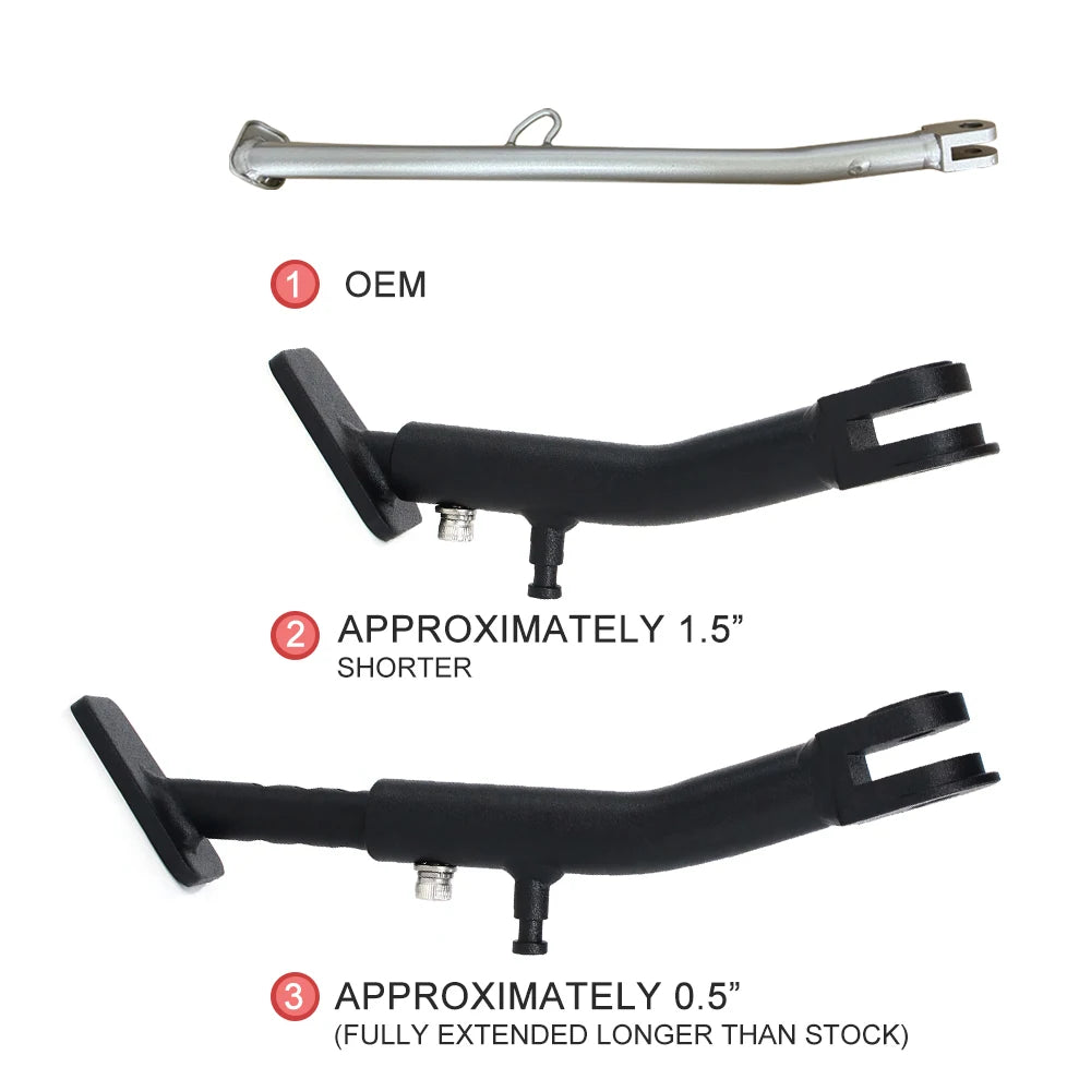 The kickstand can go from stock length to approximately 1.5''(38.1mm) shorter. It can also be extended approximately 0.5''(12.7mm) longer.